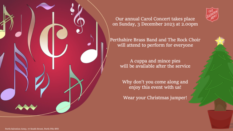 Salvation Army’s Annual Carol Concert Sunday 3rd December, 2pm, with Perthshire Brass and the Rock Choir – followed by a cuppa and mince pies.
